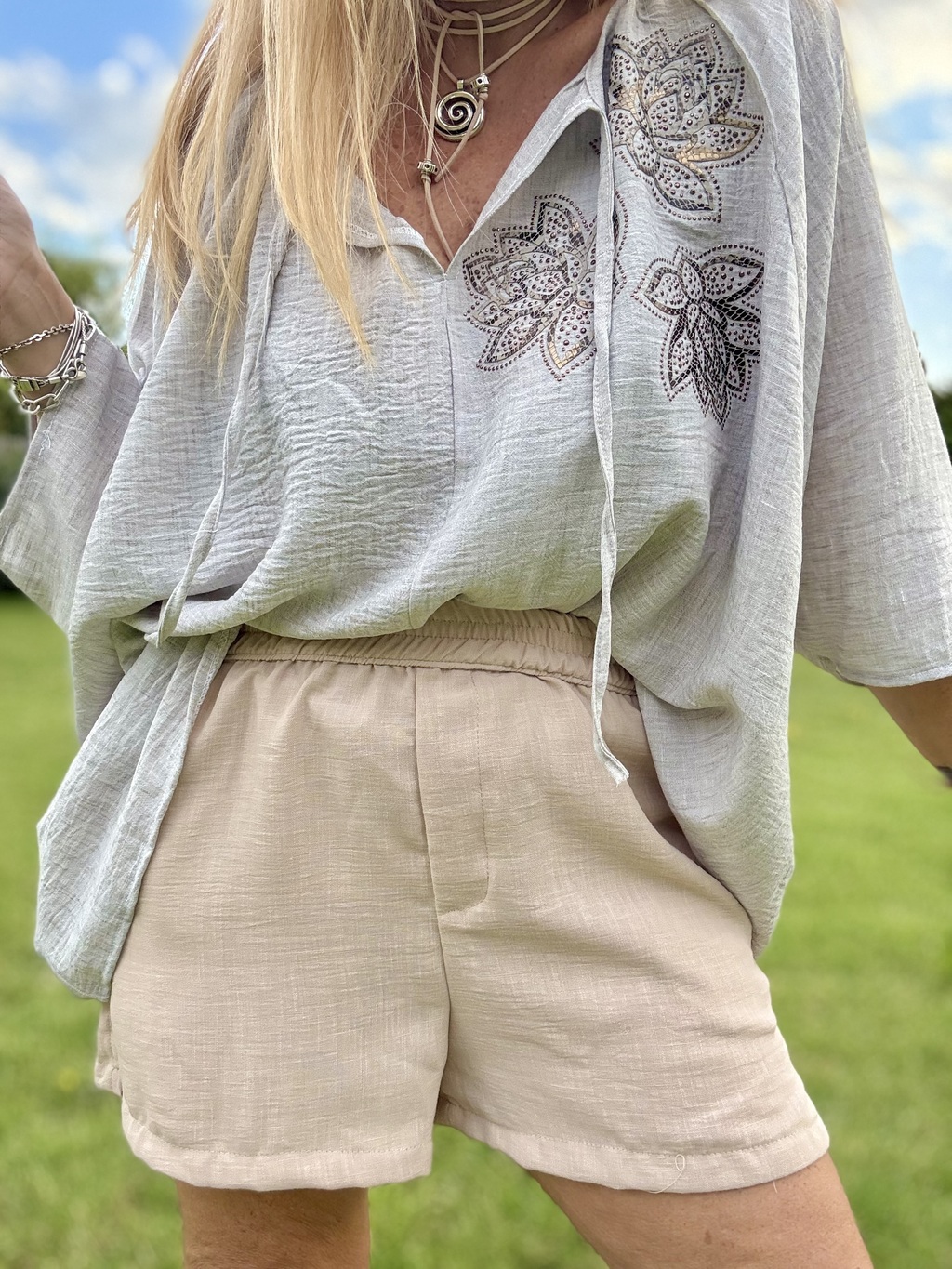 Camisola de lino gris melange plisada con mini y telas peltre peltre de 170 cm de contorno por 0,65 cm de largo con tiritas en en el escote en v