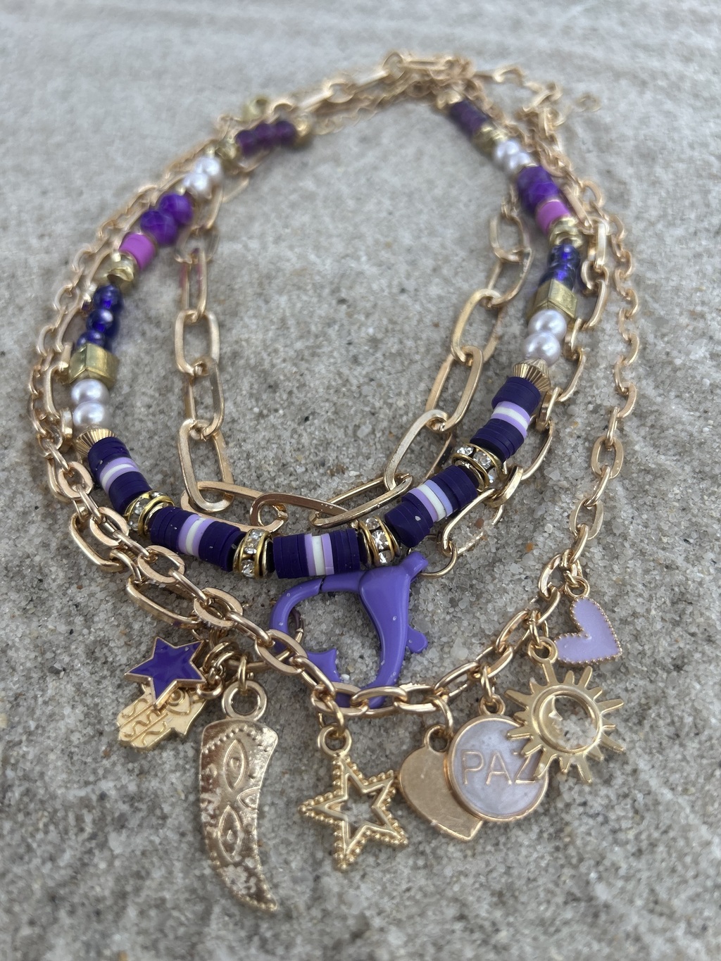 Collar cuadruple en metal dorado , violeta y lila , se pueden usar juntos o por separado ya que cada collar tiene su gancho
