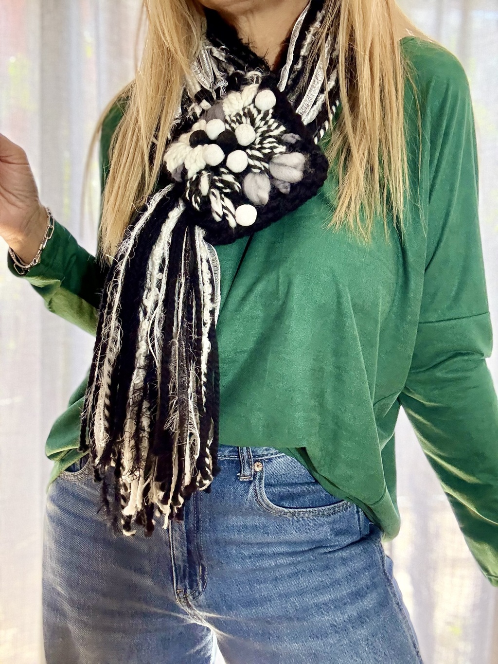 Cuello cintas de pura lana base negro tejido al croyet combinado con grises, negros y manteca bordado y tejido totalmente a mano , el cuadrado de 0,14 por 0,14 y el largo de los flecos 0,80 cm