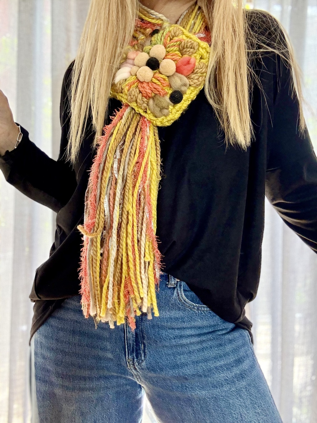 Cuello cintas de pura lana base maiz tejido al croyet combinado con negros ,naranjas y tonos tierra tejido totalmente a mano , el cuadrado de 0,14 por 0,14 y el largo de los flecos 0,80 cm