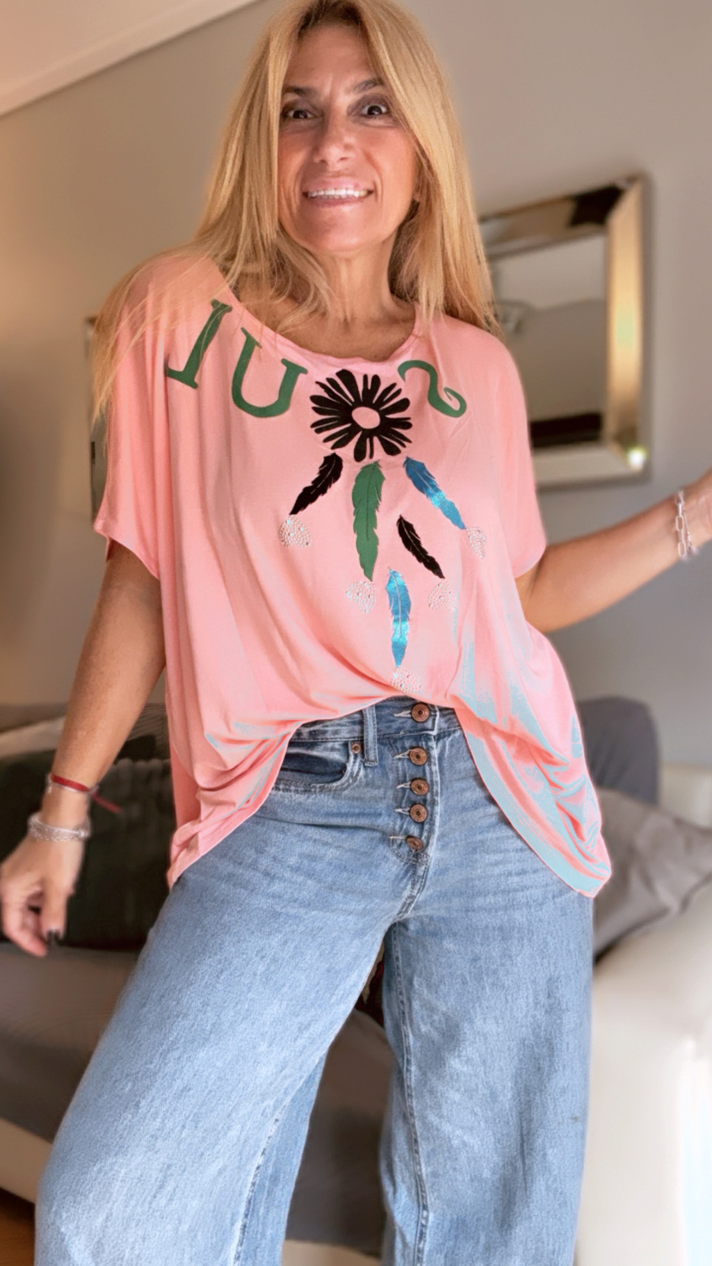 Remeron de modal mangas cortas cuello redondo de 140 cm de contorno por 0,65 cm de largo con aplique De letras soul y corazones en mini strasses plata