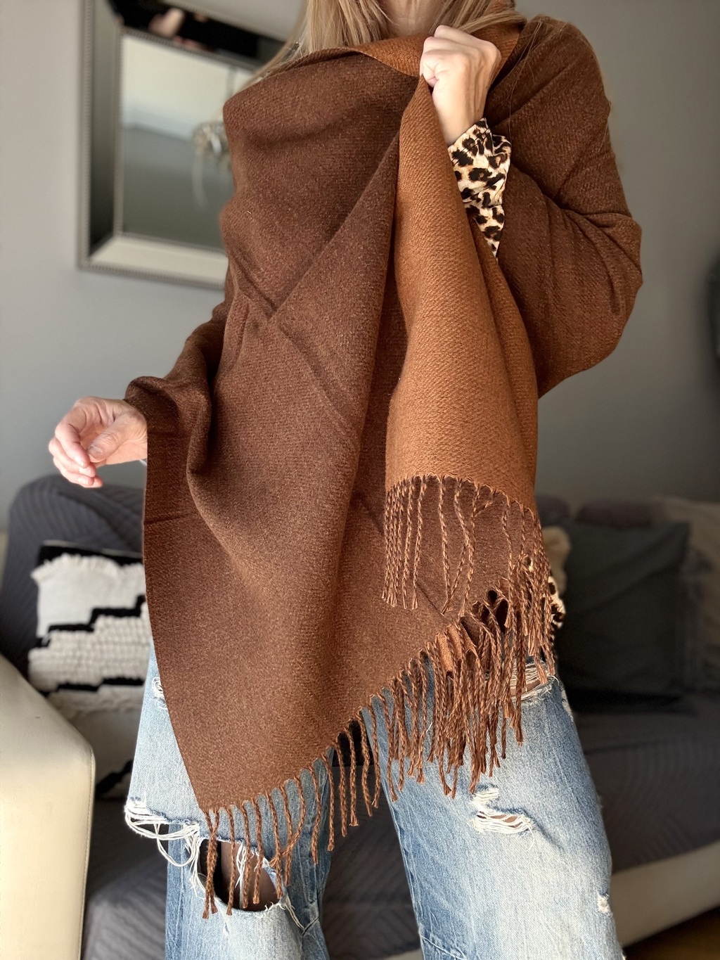 Maxi bufandon de lana reversible de un lado chocolate más oscuro que del otro de 2 m de largo por 0,70 cm de ancho con flecos en los extremos