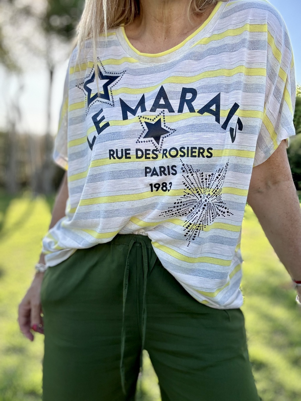 Remera de flame rayado con detalles de amarillo y lurex de 120 cm de contorno por 0,60 cm de largo, cuello redondo, mangas cortas