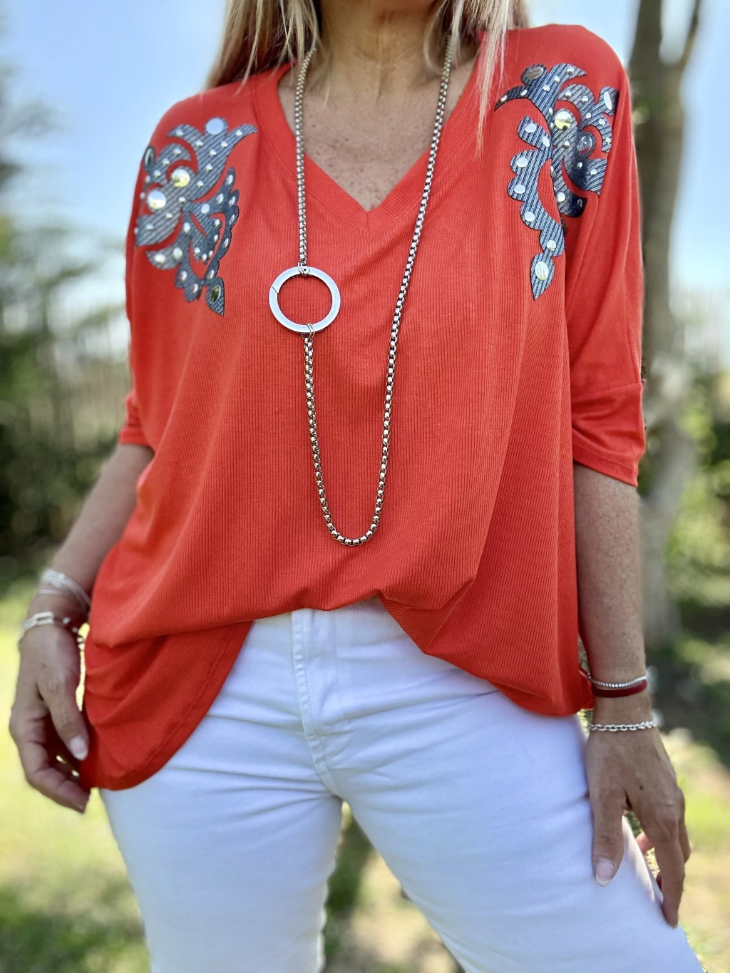 Maxi remeron de morley escote en v color naranja de 150 cm de contorno de ancho por 0,65 cm de largo con aplique de charretera en tela metalizada con tachitas