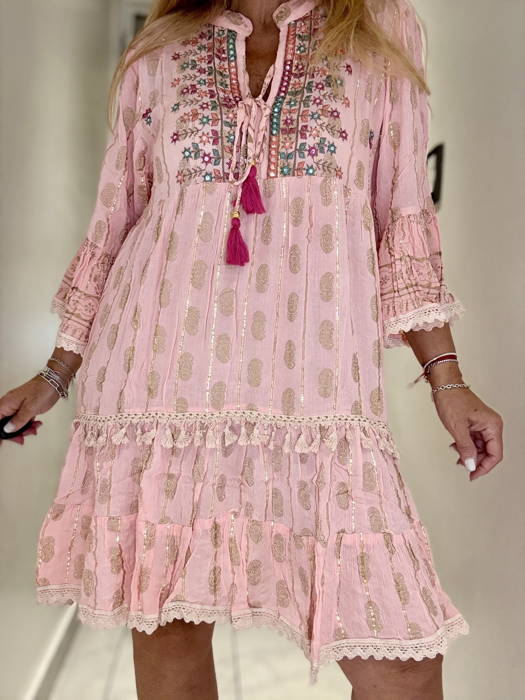 Vestido de algodón de india color rosa con lurex ,búlgaros en dorado , bordado en el pecho y borlas en la falda con tiras en el escote de 120 cm de contorno de busto , 140 cm de contorno de caderas por 0,85 cm de largo