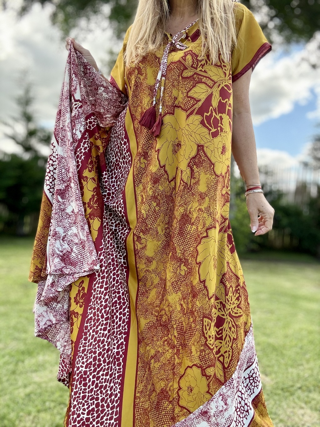 Vestido de seda de india estampado corte al bies de 125 cm de contorno de busto, 180 cm de contorno de cadera por 130 cm de largo , margas cortas amplias , escote con tiritas y mini pompón al tono
